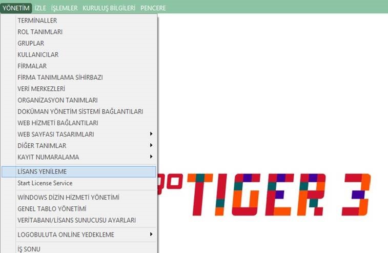 YÖNETİM başlığı altında LİSANS YENİLEME seçeneği vardır , tıkladığımızda lisans yenileme başlayacaktır diye uyarı vermektedir, Tamam diyerek devam ediyoruz. Sonraki ekranda kullandığımız lisanslar ile ilgili bilgilendirme gelecektir, bu ekrana da tamam diyerek devam ediyoruz.